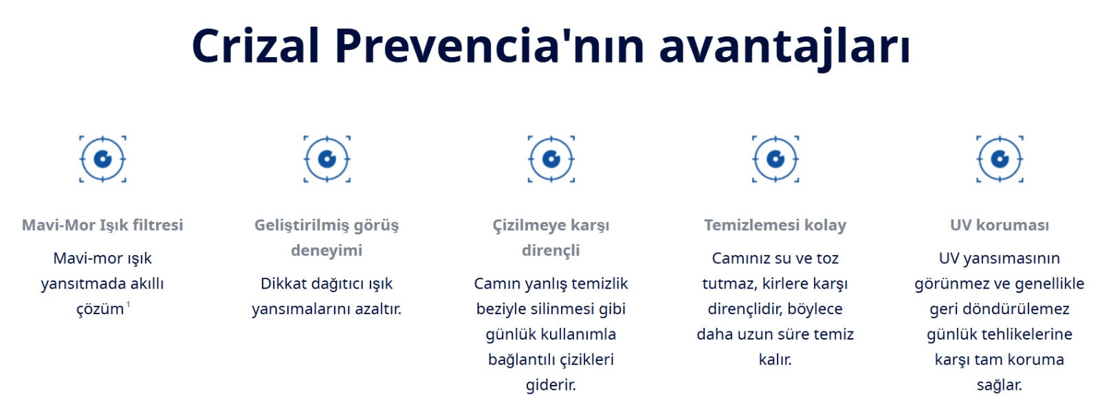 Crizal Prevencia, tüm Crizal UV camlarında olduğu gibi, camın arka yüzeyindeki yansımaları neredeyse tamamen ortadan kaldırarak, kullanıcıyı camın arka yüzeyinden gelebilecek tehlikeli UV ışınlarına karşı korur.