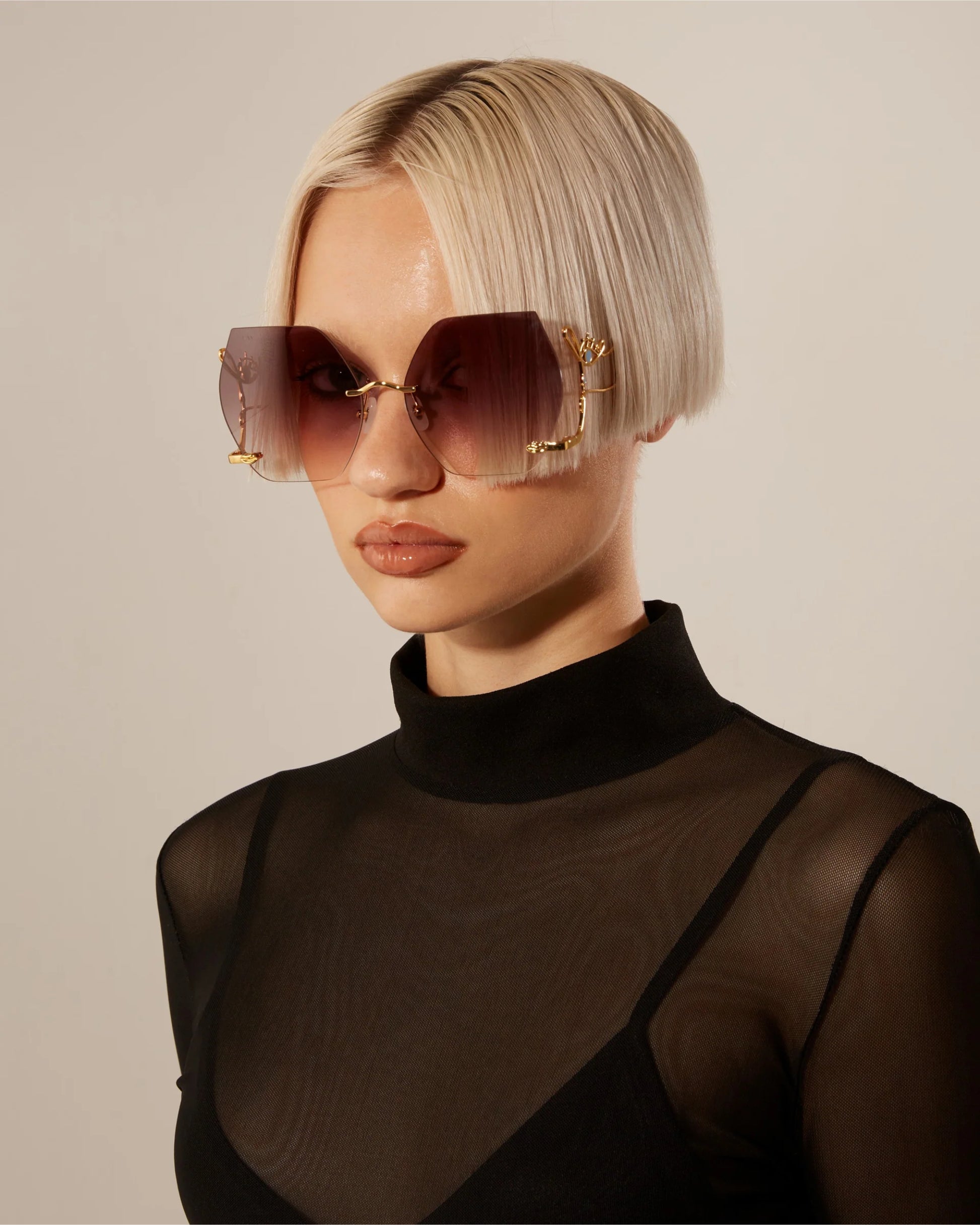 Bu model, sadece bir güneş gözlüğü değil; yüzünüzde bir stil bildirgesi. Champagne tonunun zarafetiyle geometrik formun çarpıcılığı buluşuyor. Rimless tasarım sayesinde yüz hattı minimum çerçeveyle çevreleniyor, böylece aksesuar görünümünden bir adım öteye geçiliyor. Jade burun pedleri konforu artırırken, altın-ton metal detaylar güçlü bir lüks hissi katıyor. Şehirli, şık ve kendine güvenen kullanıcılar için ideal.