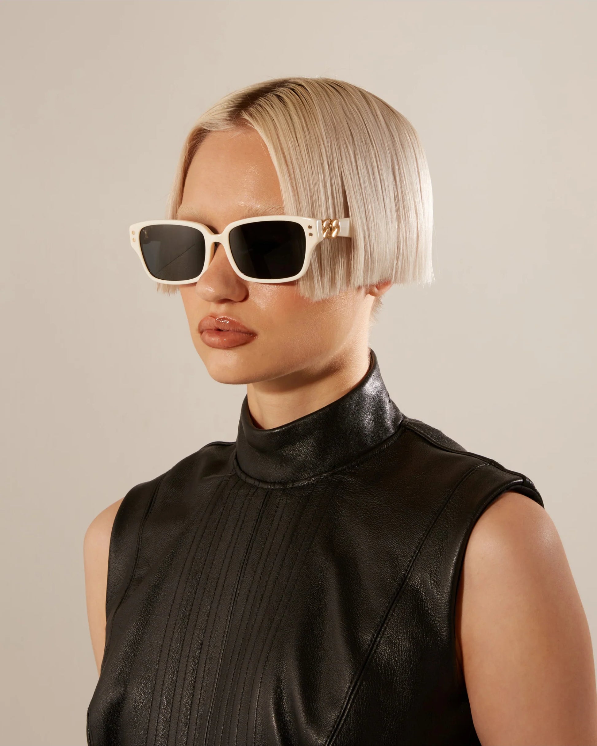 Dar dikdörtgen form, vintage esintiyi güncel bir şıklıkla birleştirir. Zincir detayları ve parlak asetat yüzey gözlüğe takı etkisi kazandırırken, günlük şehir kullanımı için rahat bir stil sunar.