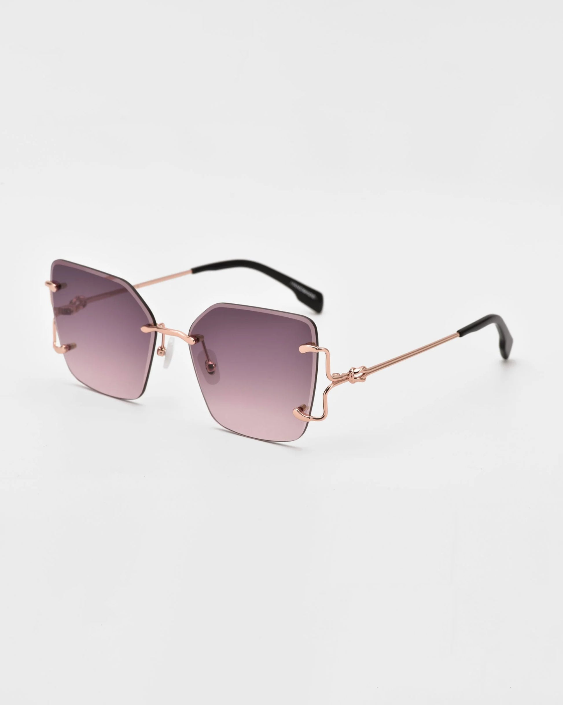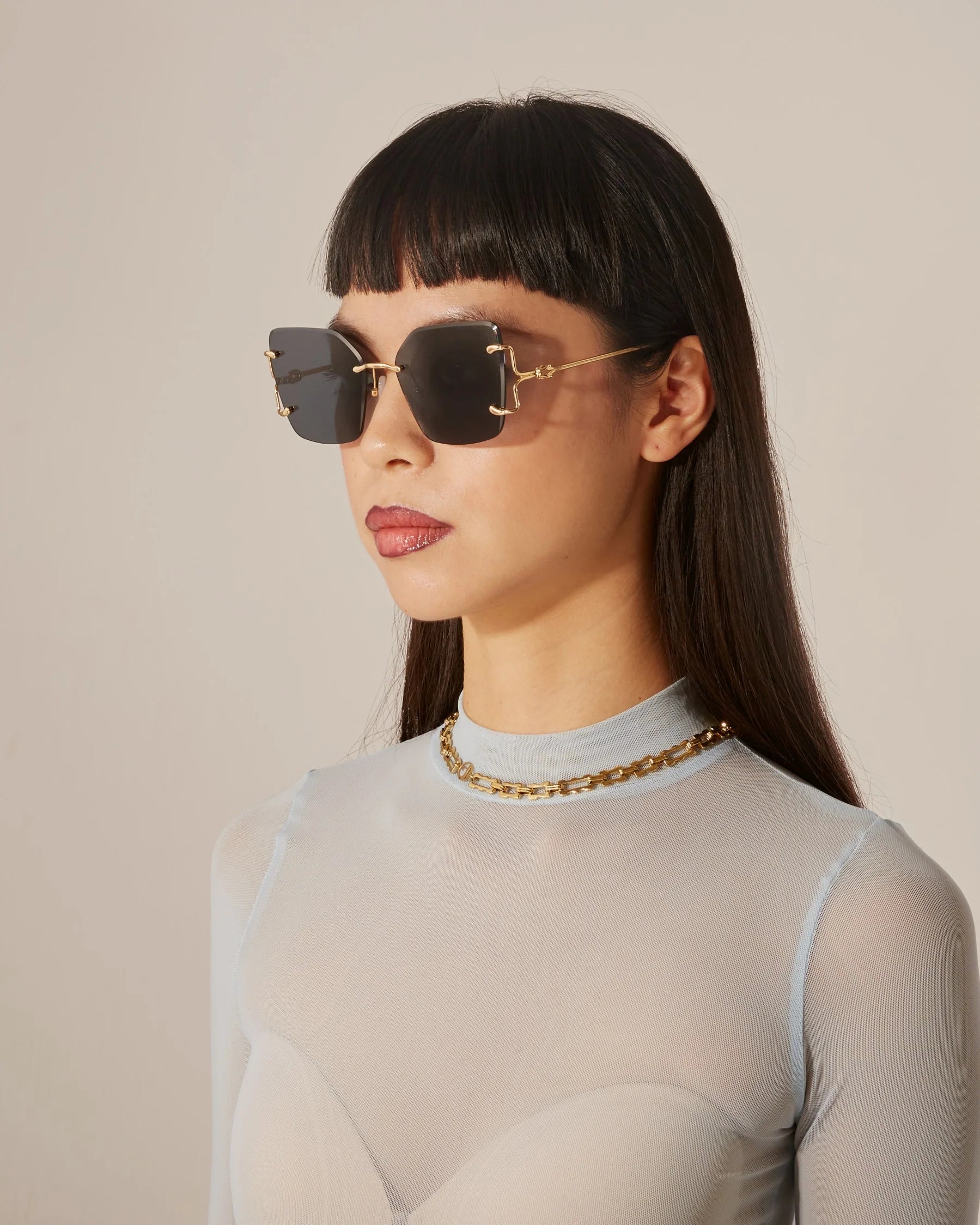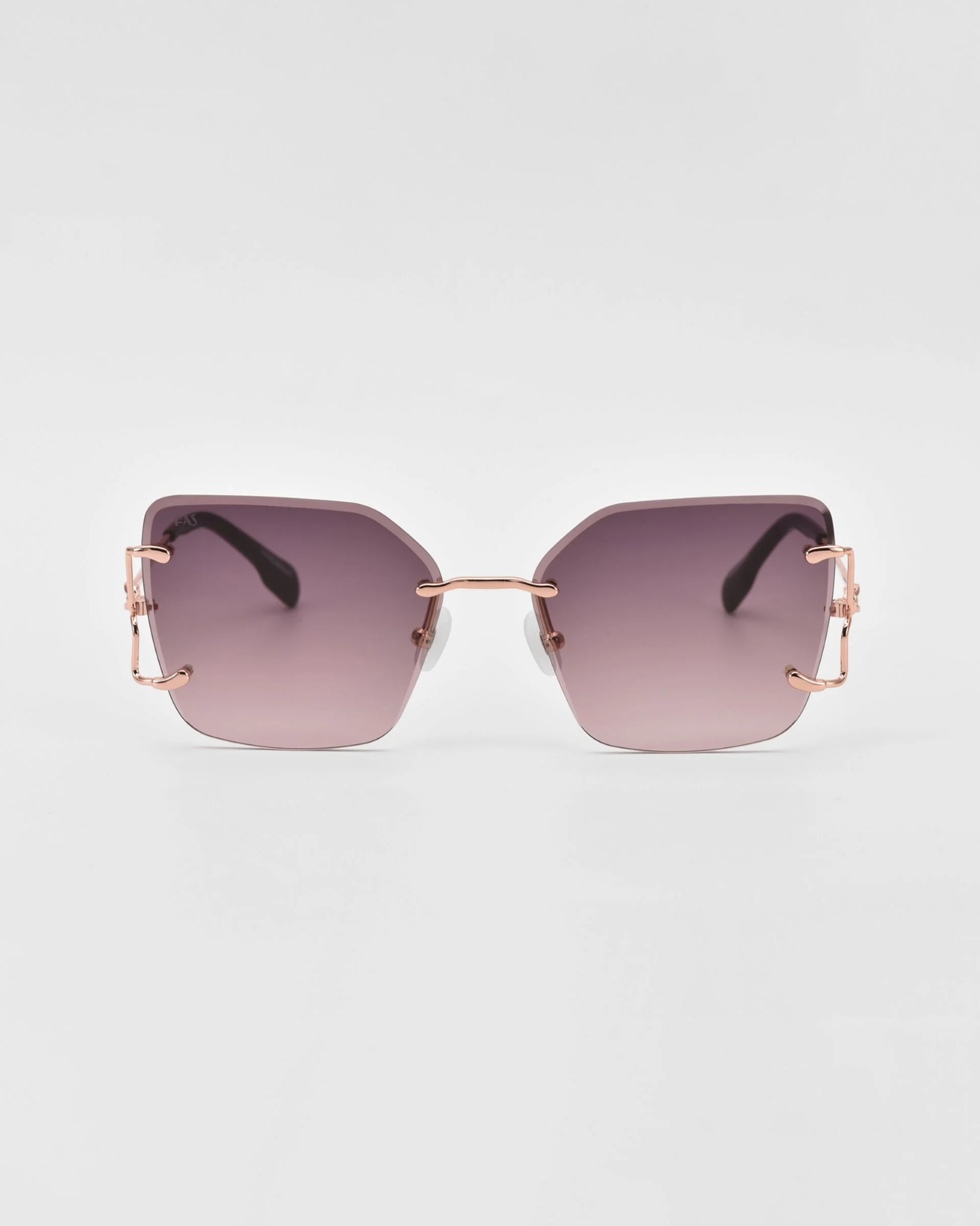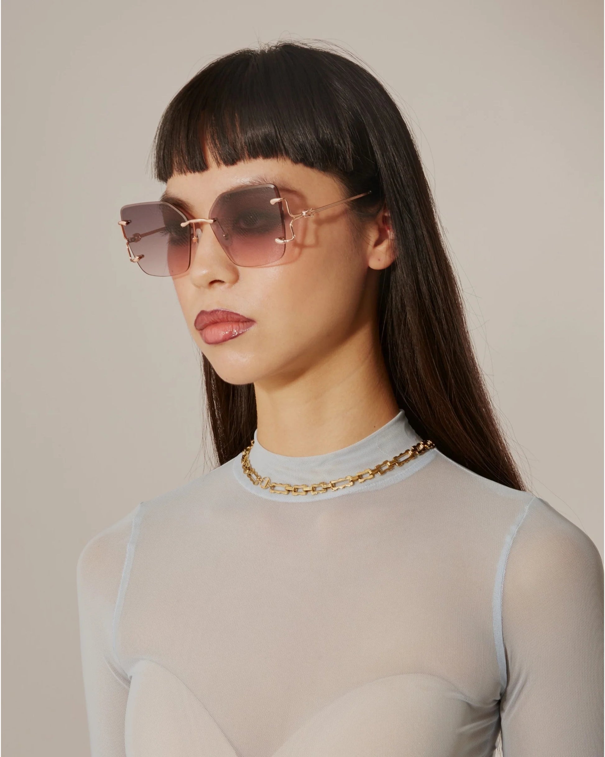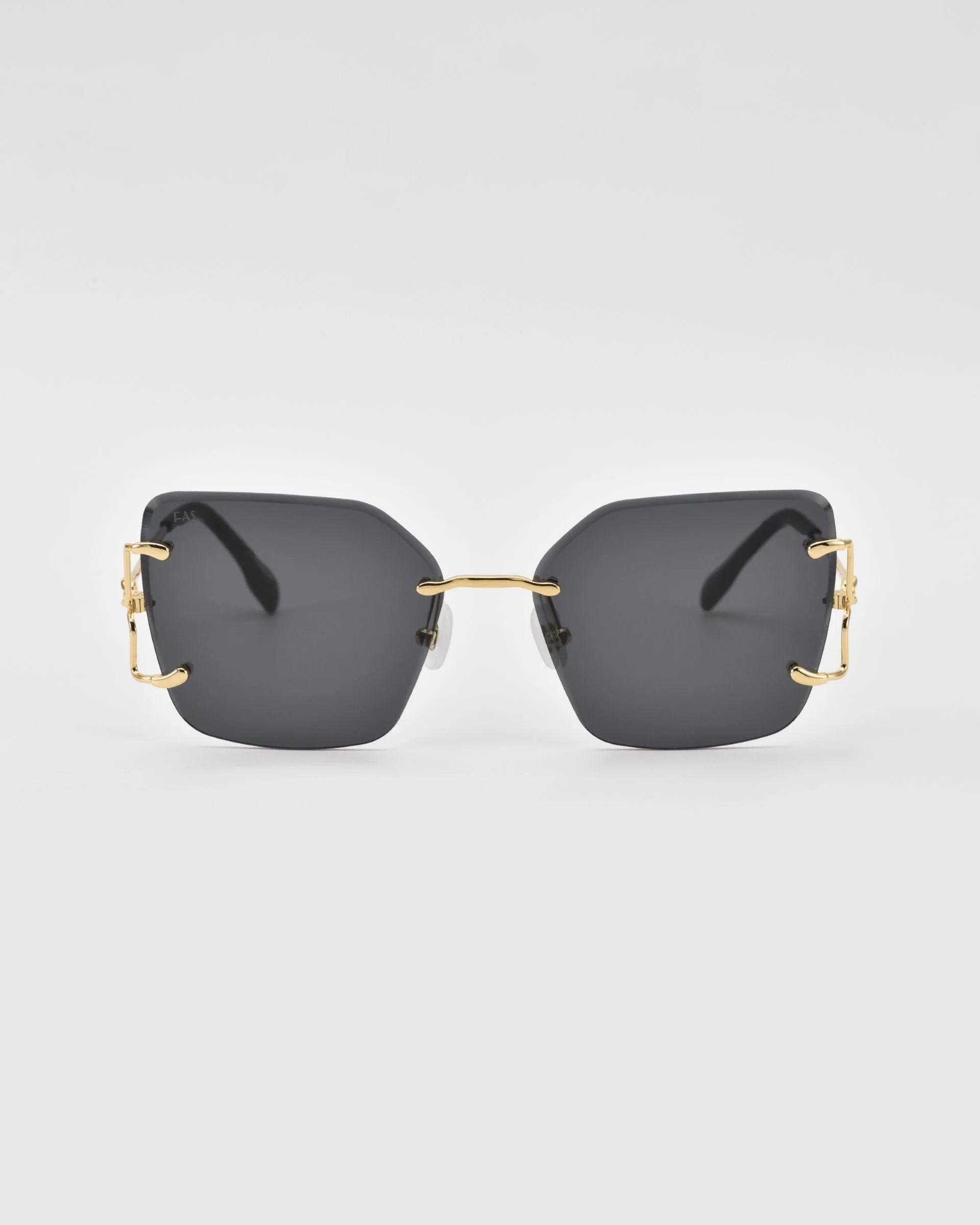 For Art’s Sake Starlit, çerçevesiz büyük kare camları, ince metal sapları ve ön cama taşıdığı düğüm şeklindeki metal detaylarıyla tam bir “statement” güneş gözlüğüdür. Soğuk tonlu degrade camlar ve gerçek jade taş burun pedleri ile hem konfor hem de lüks dokunuş bir aradadır. Günlük şehir stilinden özel davet kombinlerine kadar her ortamda iddialı ve modern bir görünüm sunar.