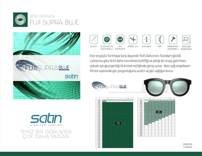 Fuji Supra Blue, dijital ekranlardan gelen zararlı mavi ışığı özel filtresiyle engeller. Bu sayede göz yorgunluğunu azaltır ve göz sağlığınızı korur. Özellikle bilgisayar, tablet ve telefon kullanımı yoğun olanlar için idealdir.
