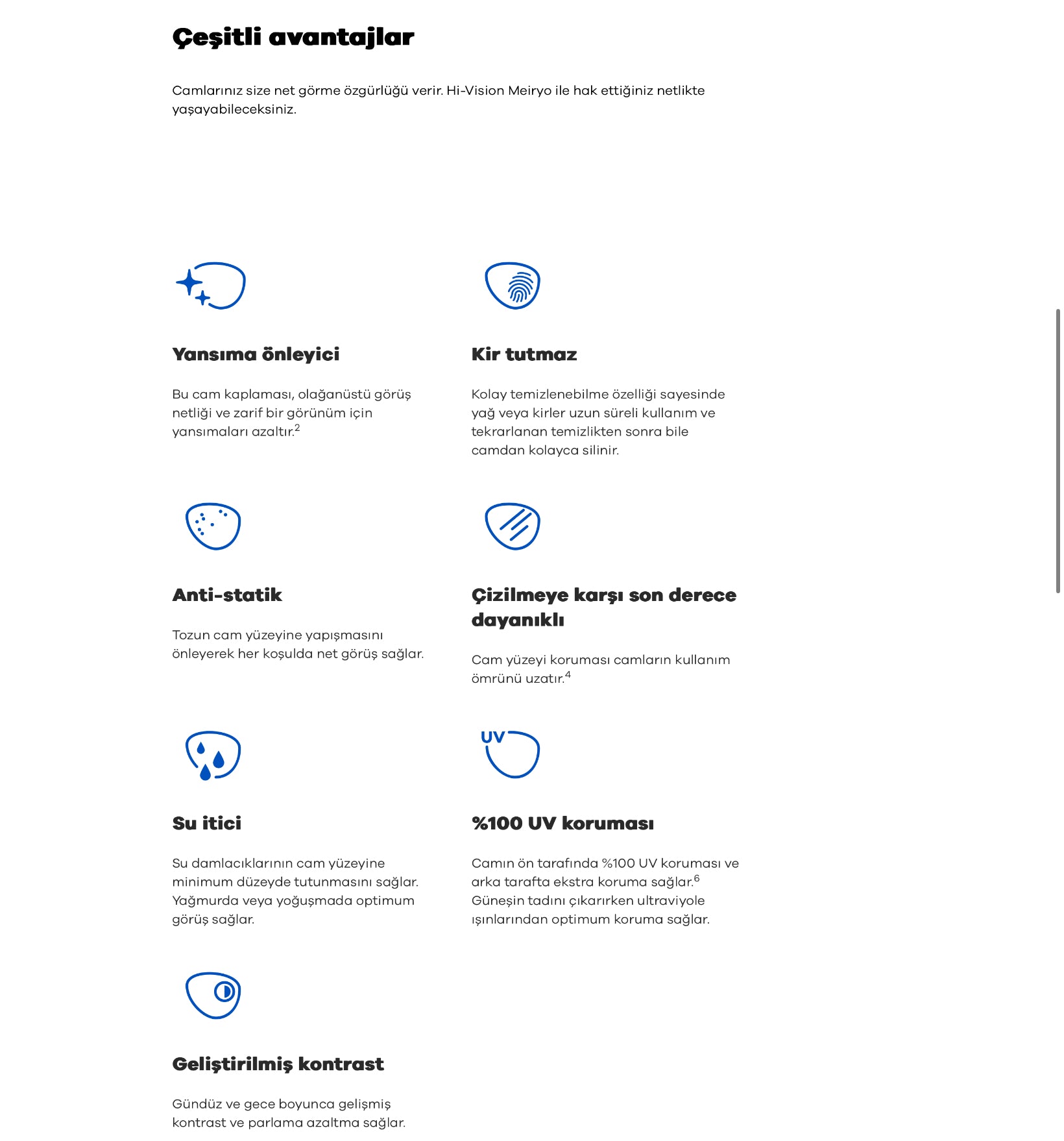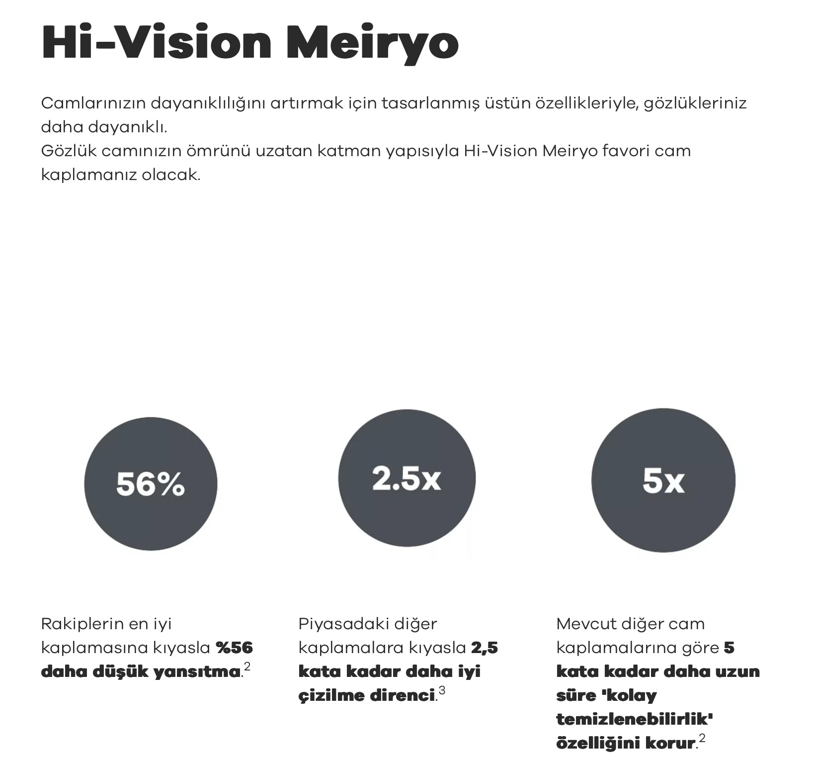 HOYA’nın yenilikçi kaplama teknolojisiyle geliştirilen 1.60 Hi-Vision Meiryo, estetik, dayanıklılık ve net görüşü bir araya getirerek günlük kullanımda maksimum konfor sunar. Standart kaplamaların ötesine geçerek, cam yüzeyinde daha az yansıma, daha yüksek netlik ve üstün dayanıklılık sağlar.