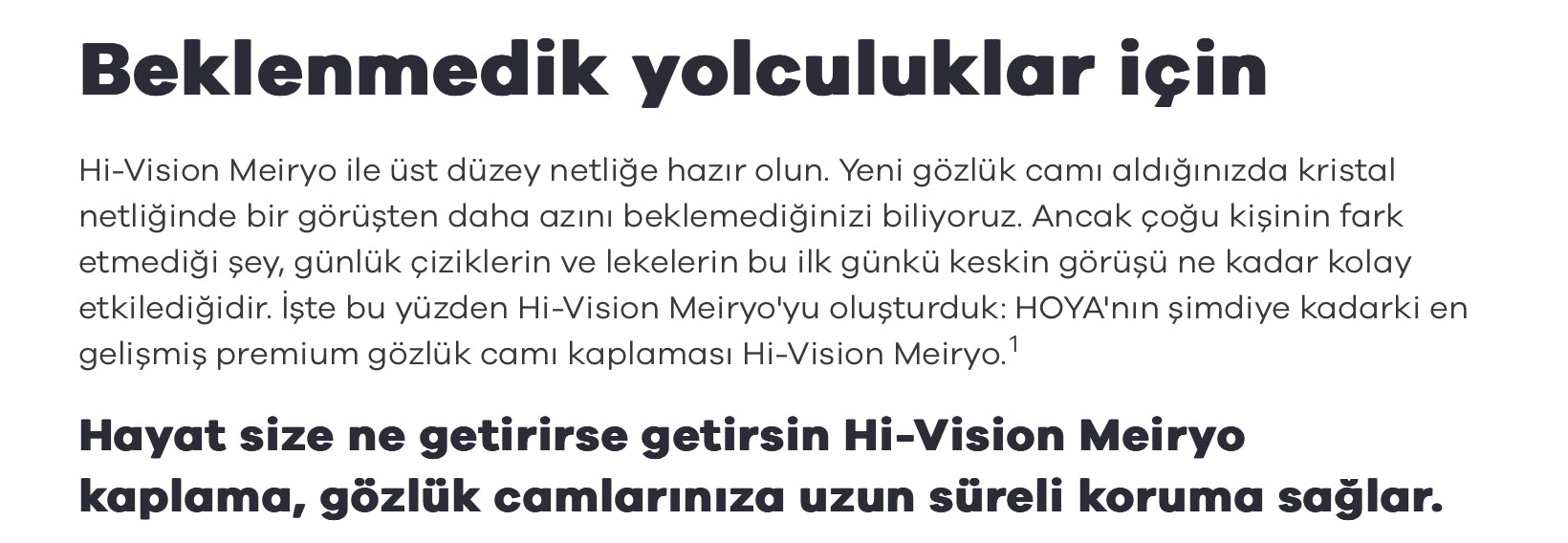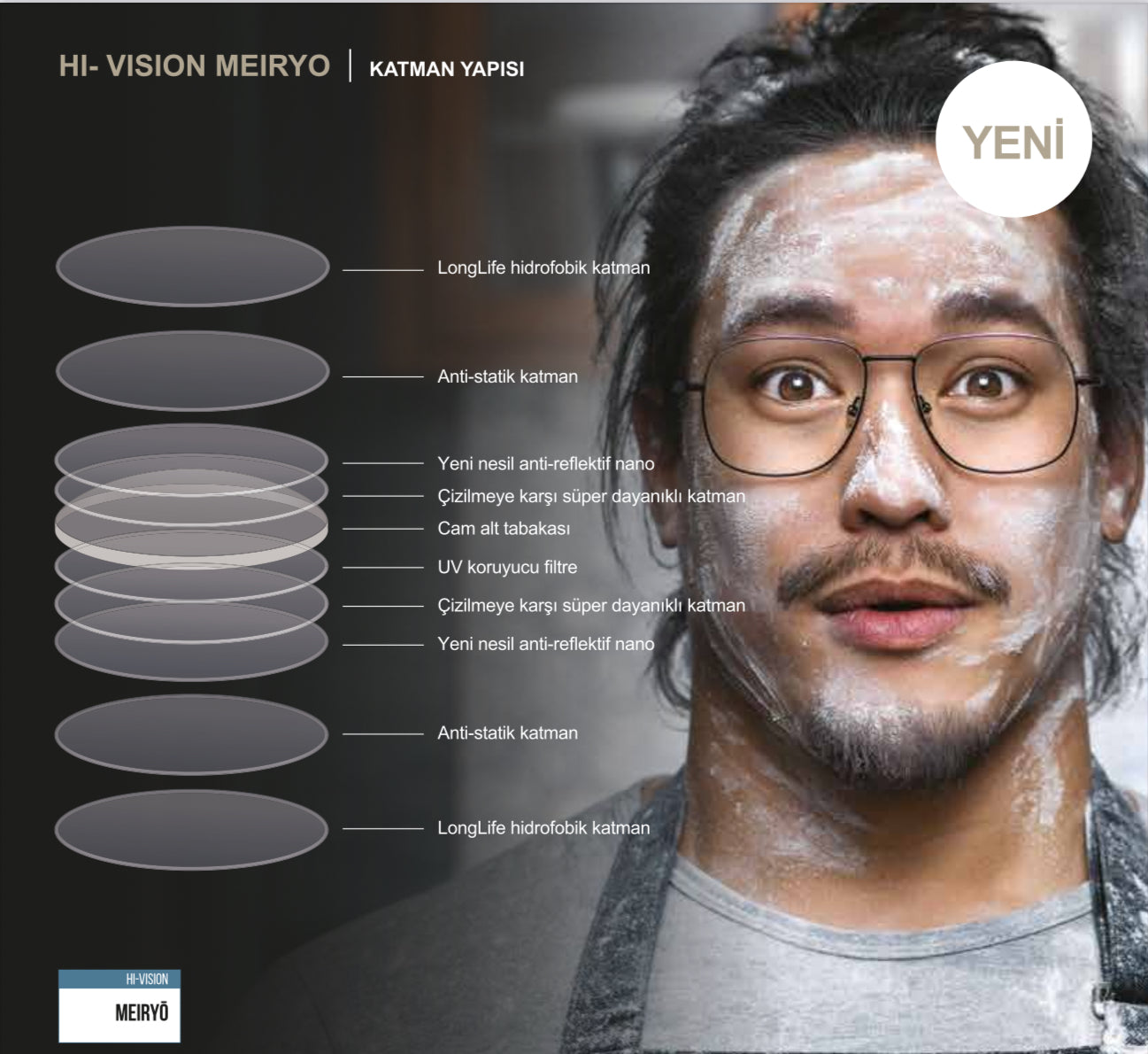 Hi-Vision Meiryo, HOYA’nın en yeni nesil yansıma önleyici kaplama teknolojilerinden biridir. Japonca’da “Meiryo (明瞭)” kelimesi “netlik, berraklık ve açıklık” anlamına gelir. Bu isim, kaplamanın sunduğu üstün optik netlik ve parlama kontrolüne doğrudan atıfta bulunur. Meiryo, gelişmiş çok katmanlı yapısıyla hem fonksiyonel hem de estetik olarak premium bir deneyim sunar.
