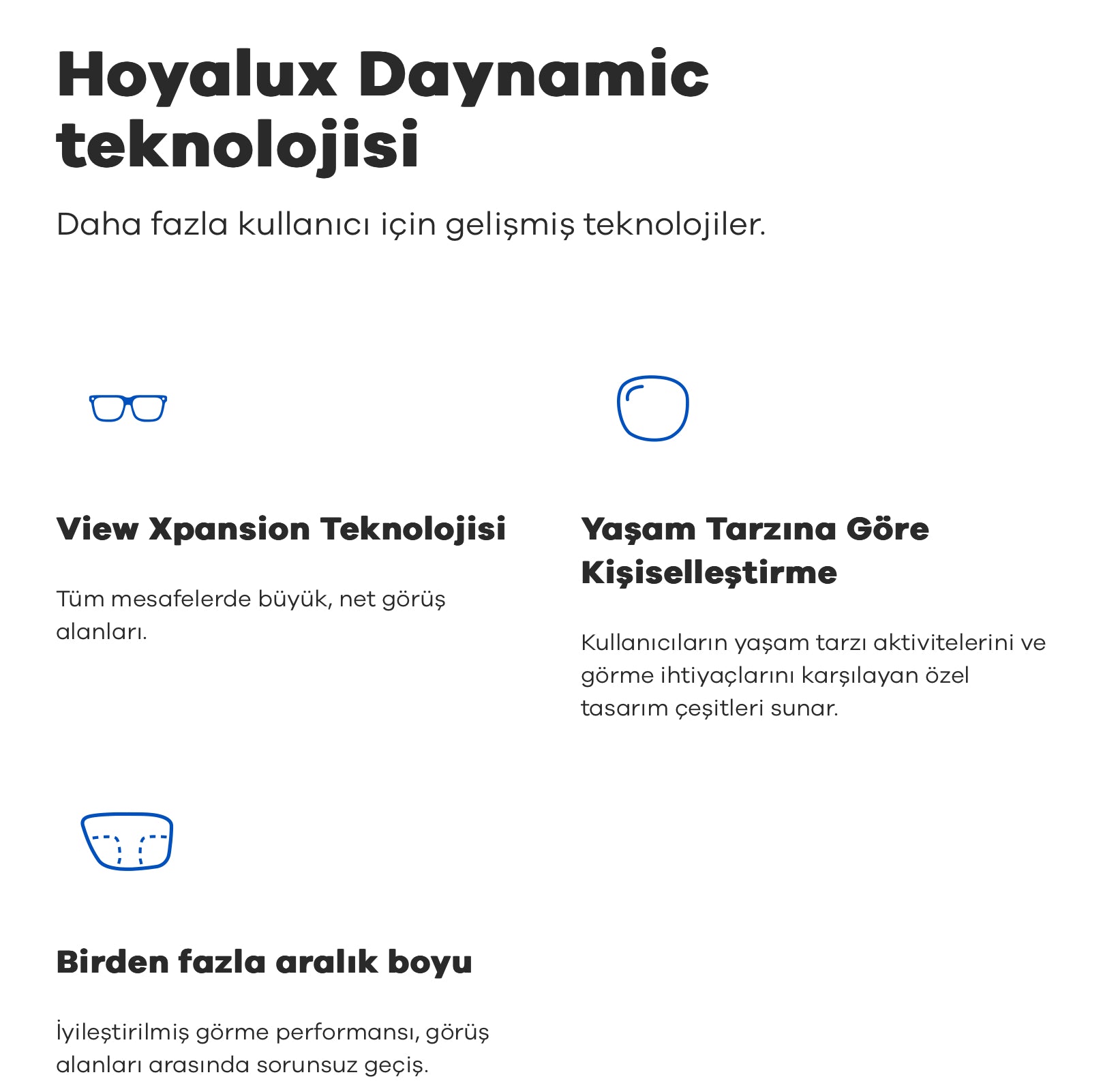 Günlük yaşam için geniş görüş alanı, net geçişler ve kolay adaptasyon.