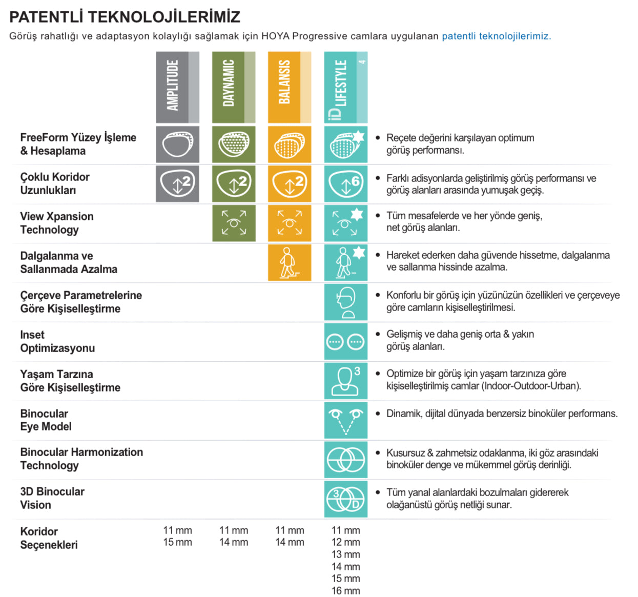 HOYA Daynamic camlar, farklı yaşam tarzlarına ve ihtiyaçlara uygun olarak çeşitli kaplama teknolojileri ile sunulmaktadır: