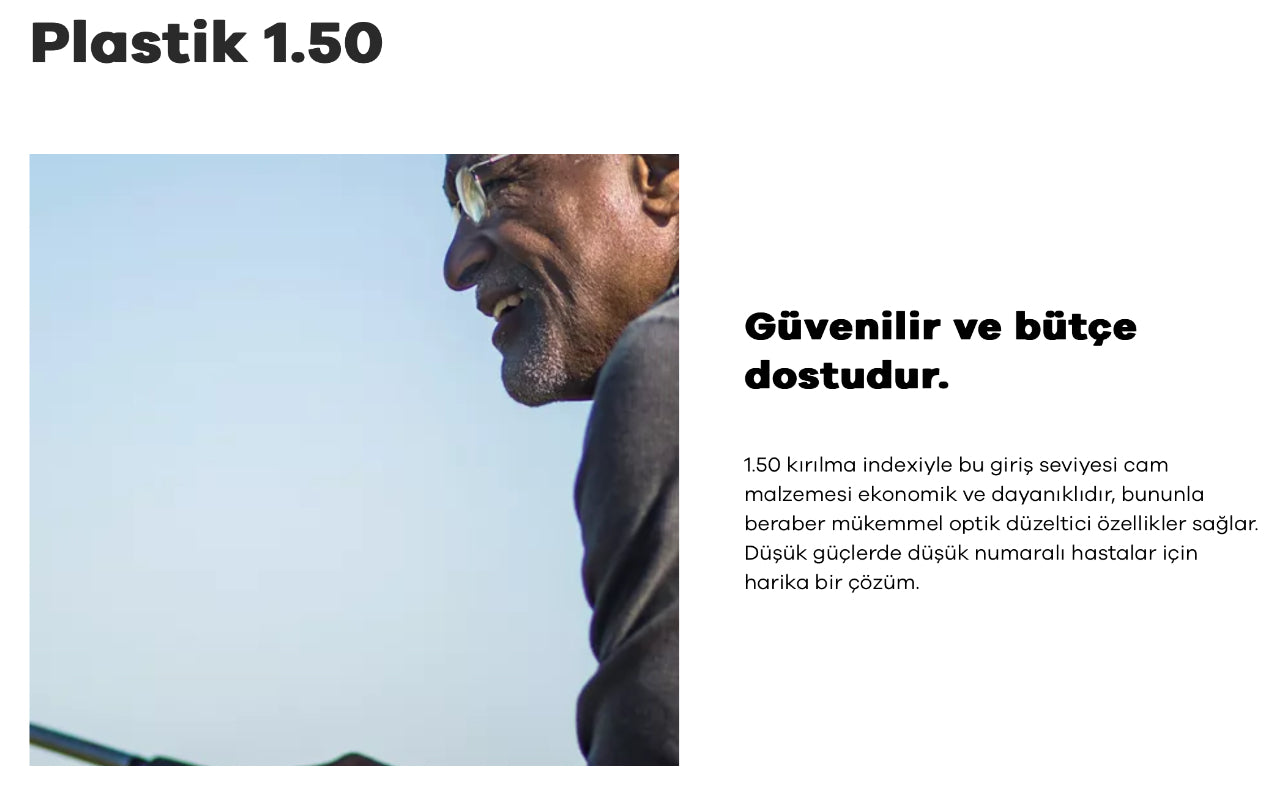 - Kırılma İndeksi: 1.50 (organik - standart kalınlık)