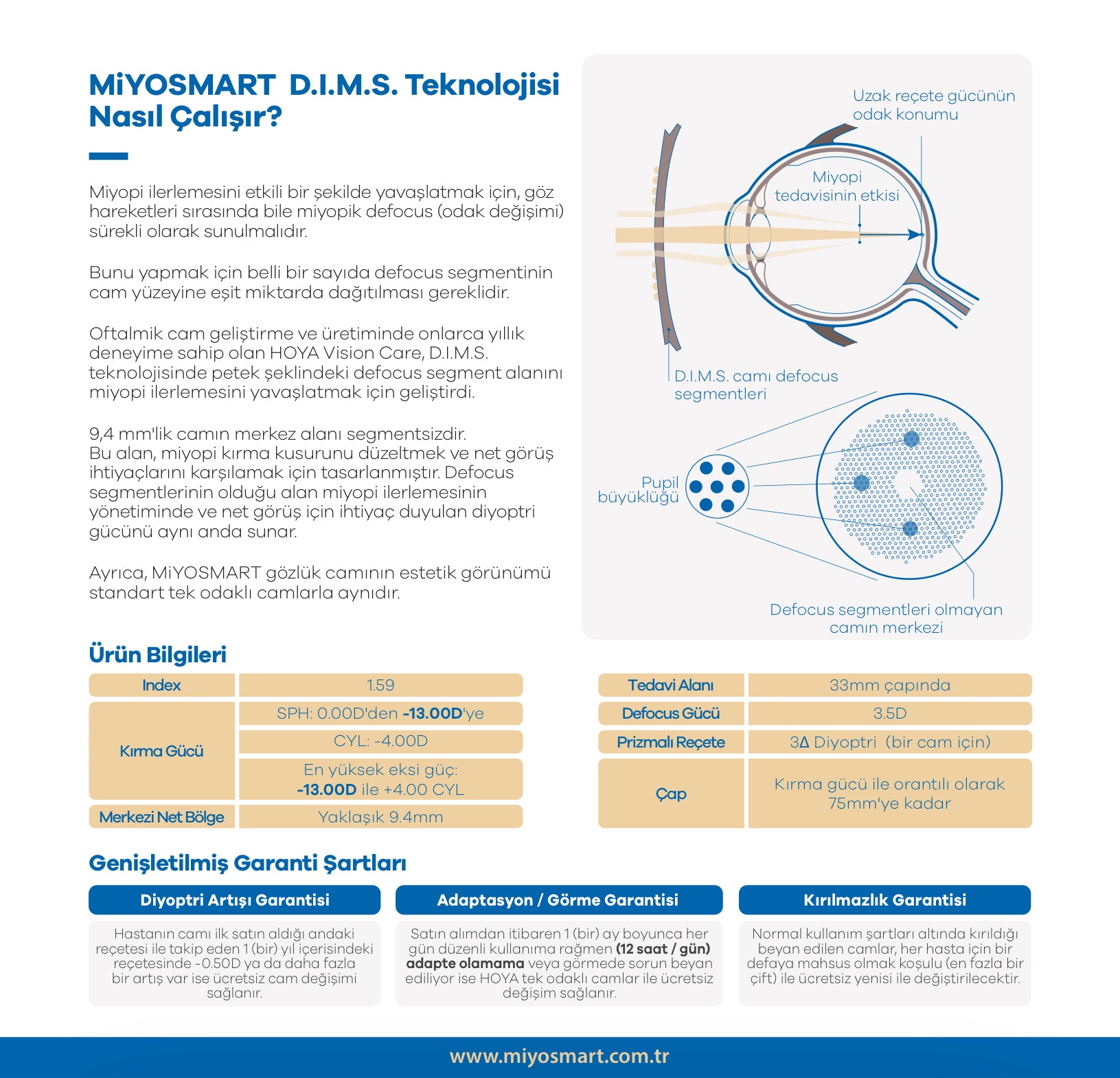 HOYA MiYOSMART, çocuklarda miyopi ilerlemesini yavaşlatmak için geliştirilmiş, ödüllü ve klinik olarak kanıtlanmış bir cam teknolojisidir. D.I.M.S. (Defocus Incorporated Multiple Segments) teknolojisi sayesinde çocuğunuzun hem net görmesini sağlar hem de miyopinin ilerlemesini %60’a kadar yavaşlatır.