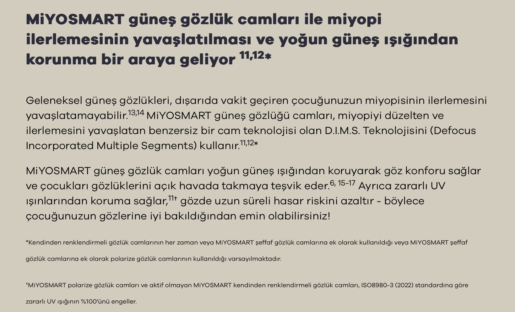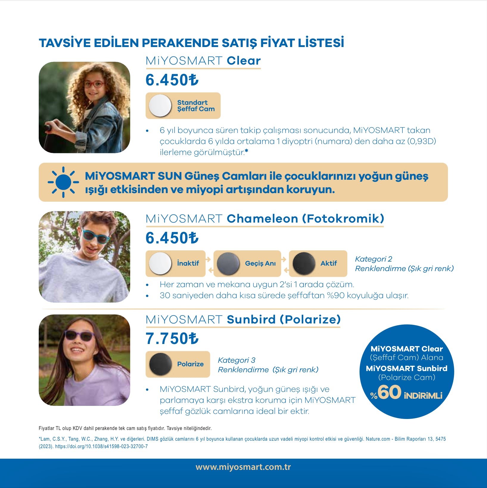 MiYOSMART lensler, çocuklarda miyopi ilerlemesini durdurmak için estetik, konforlu ve güçlü bir çözüm sunar. D.I.M.S. teknolojisiyle kanıtlanmış klinik etkisi, geniş reçete aralığı, güneş/karartma seçenekleri ve çocuk dostu sağlam yapısı ile kapsamlı bir pakettir. Kullanımı ve uzun süreli takibi için optisyeninizle detaylı değerlendirme yapmanız önerilir.