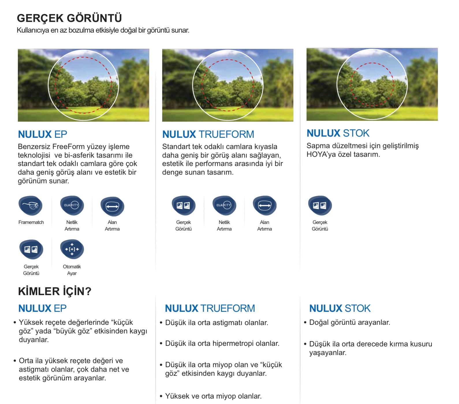 Hoya’nın gelişmiş optik teknolojisiyle üretilmiş tek odaklı RX cam serileri, kişisel görsel ihtiyaçlara uygun olarak farklı seviyelerde konfor, netlik ve estetik sunar. Bu serilerde yer alan Nulux EP, Nulux Trueform ve Nulux Stok modelleri; kullanıcıya yüksek çözünürlük, geniş görüş alanı ve doğal görüntü deneyimi sağlar.