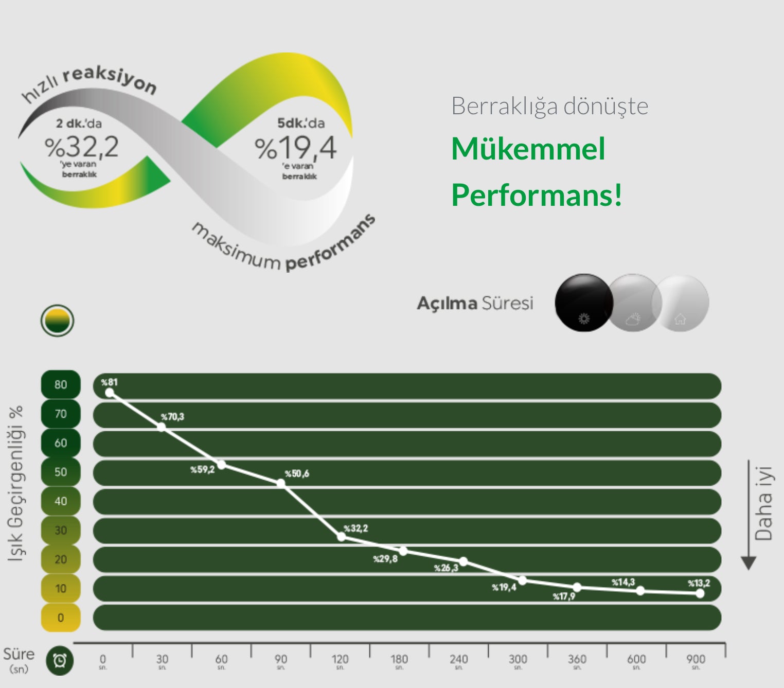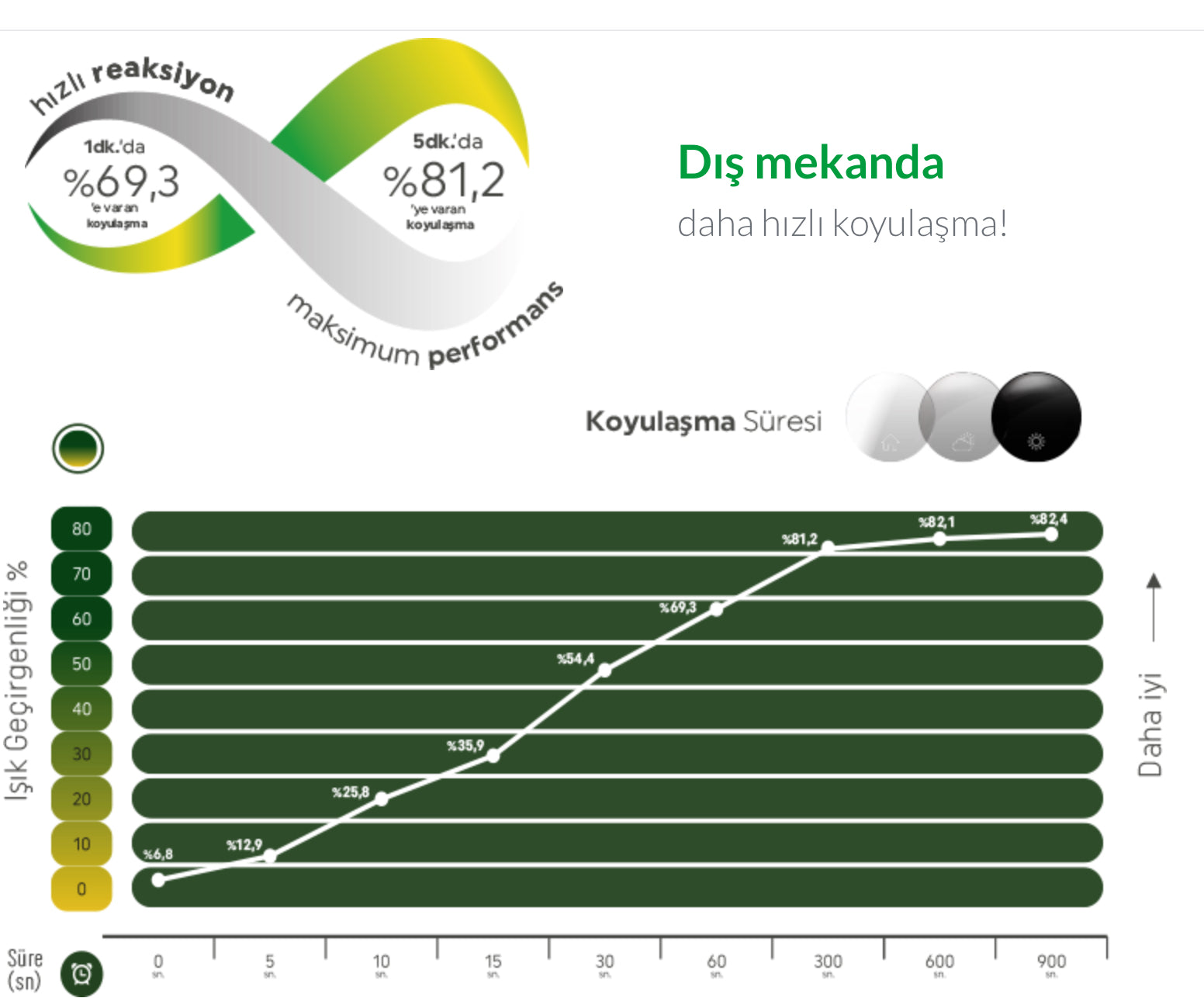 Güneş ışığında otomatik olarak koyulaşır, iç mekânda ve gece koşullarında hızla berraklaşır.