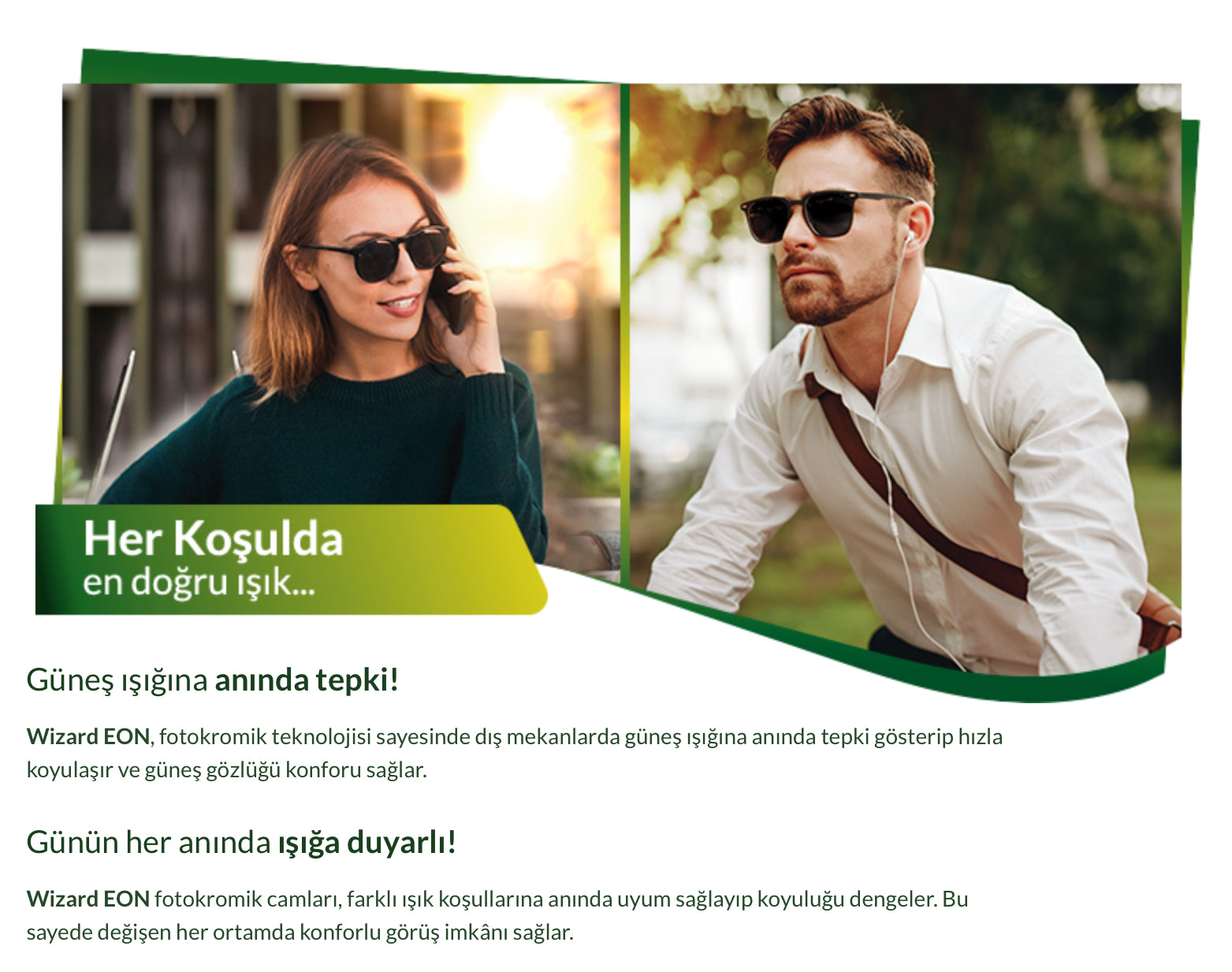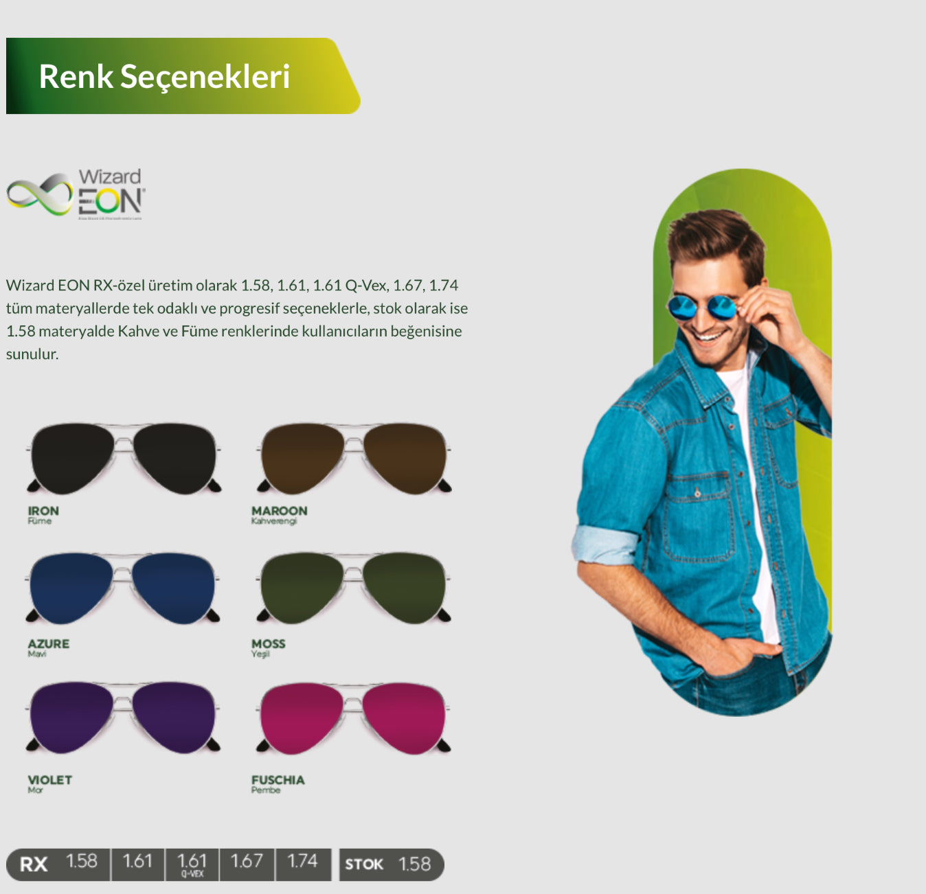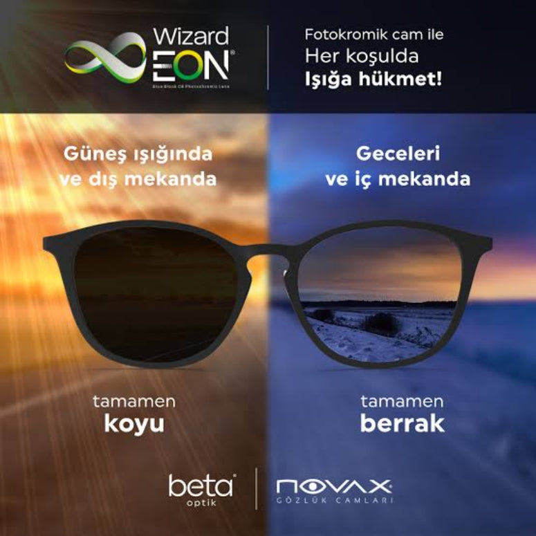 Wizard EON, Beta Optik’in yüksek performanslı fotokromik cam serisidir. Gelişmiş formülü sayesinde hem dış hem iç mekânda maksimum görüş konforu, gelişmiş UV ve mavi ışık koruması ve estetik görünüm sunar. Gözlük kullanıcılarının gün boyu değişen ışık koşullarına zahmetsizce uyum sağlamasını hedefler.
