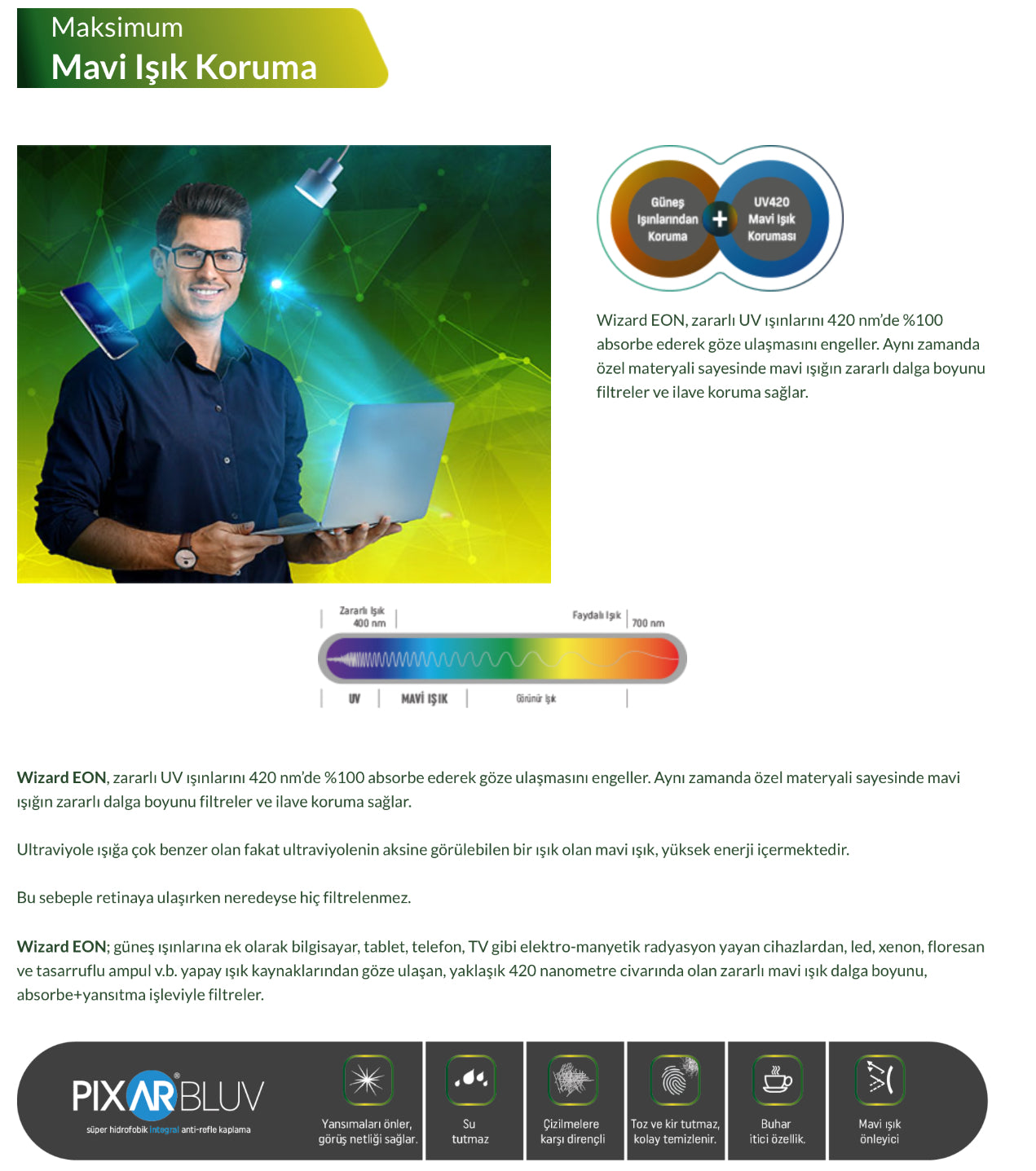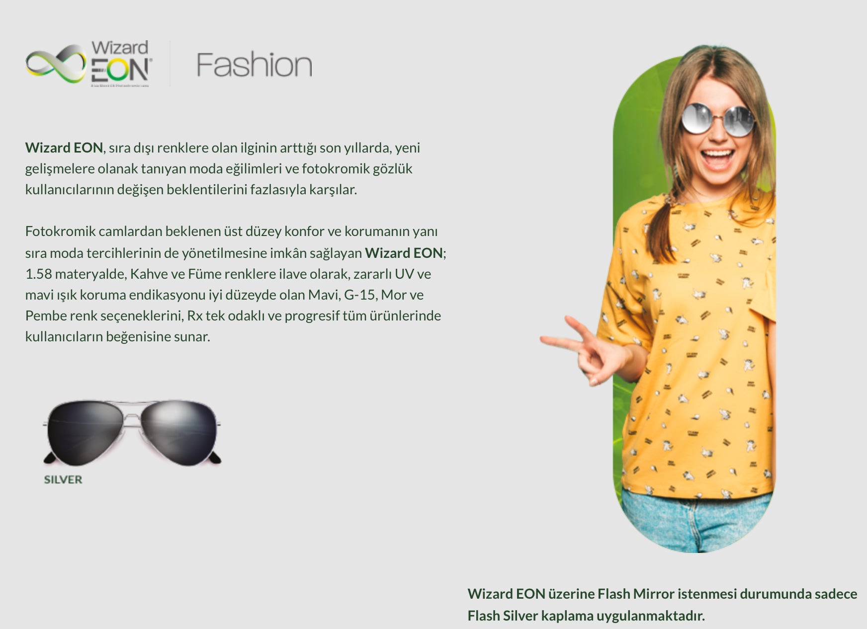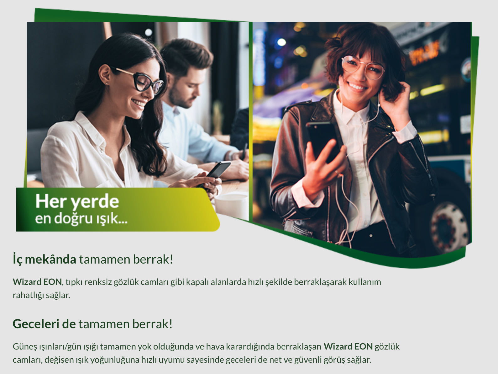 Wizard EON, Beta Optik’in yüksek performanslı fotokromik cam serisidir. Gelişmiş formülü sayesinde hem dış hem iç mekânda maksimum görüş konforu, gelişmiş UV ve mavi ışık koruması ve estetik görünüm sunar. Gözlük kullanıcılarının gün boyu değişen ışık koşullarına zahmetsizce uyum sağlamasını hedefler.
