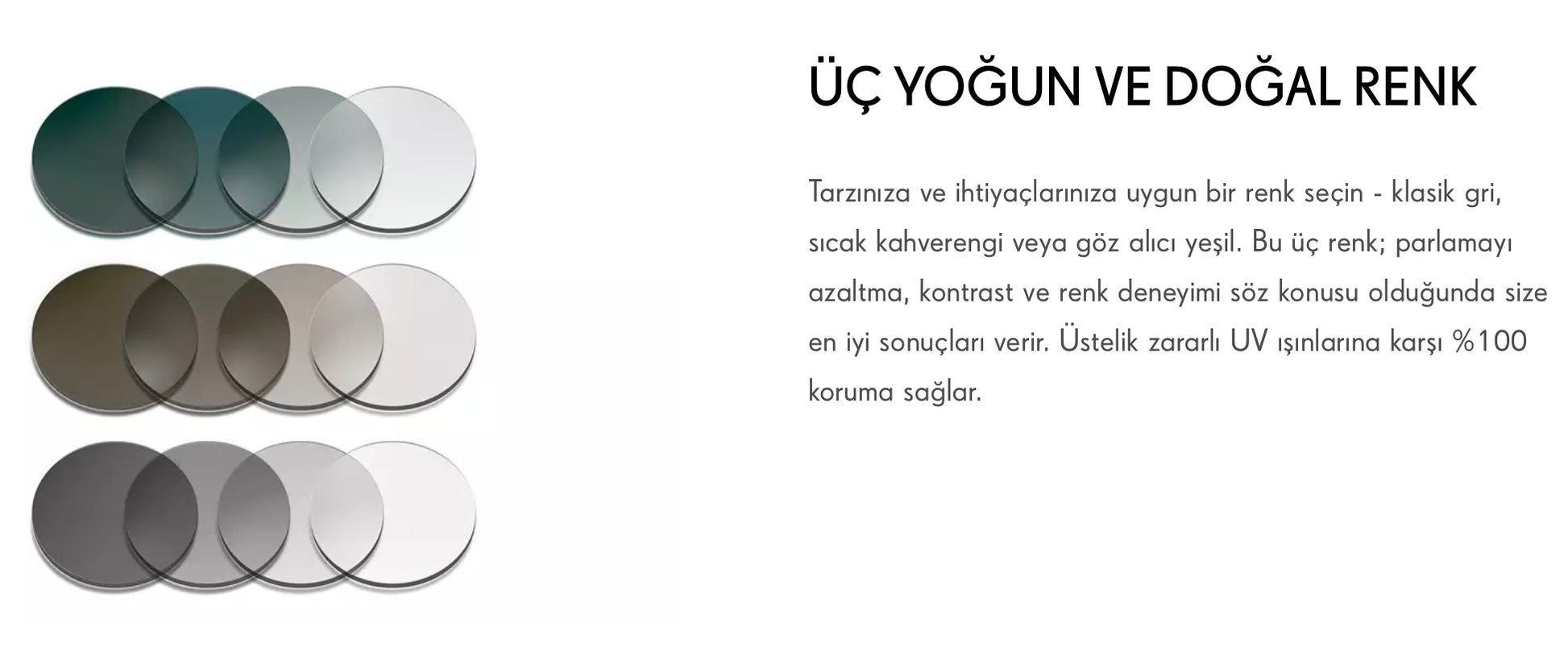 Sensity serisi, füme (gri) ve kahverengi gibi doğal ve estetik tonlarla sunulmaktadır. 1.50 indeksli modellerde Türkiye üretimi mevcuttur; ancak yeşil renk yalnızca yurt dışı üretimle sağlanabilir.