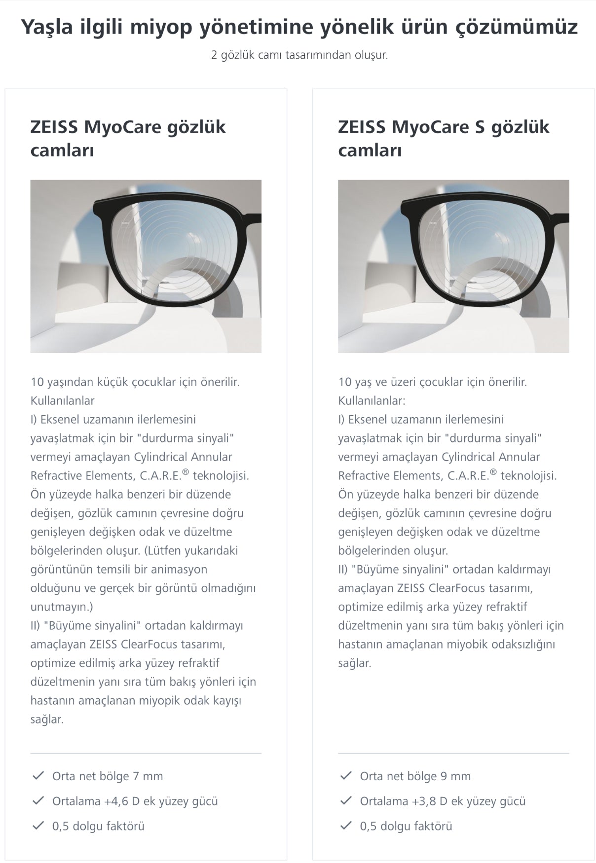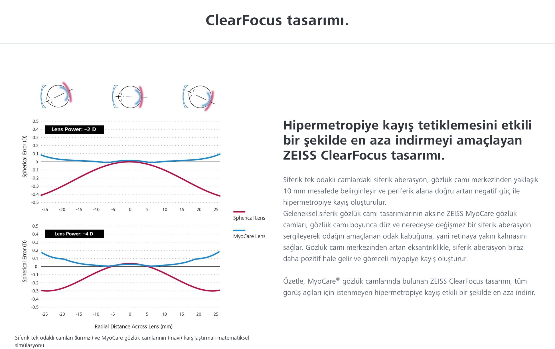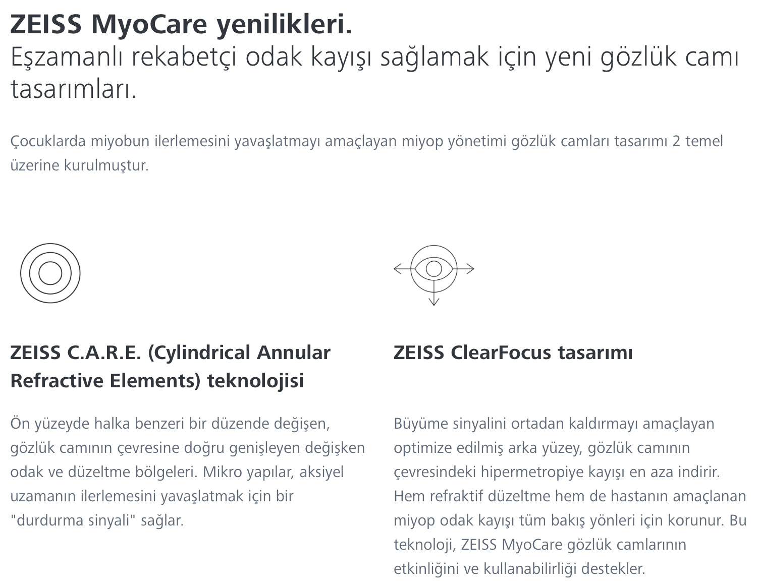 - ZEISS C.A.R.E. Teknolojisi (Cylindrical Annular Refractive Elements): Camın çevresine yerleştirilen halka şeklindeki özel odak bölgeleri sayesinde görme merkezi net kalırken, miyopi ilerlemesini azaltan bir defokus etkisi yaratılır.