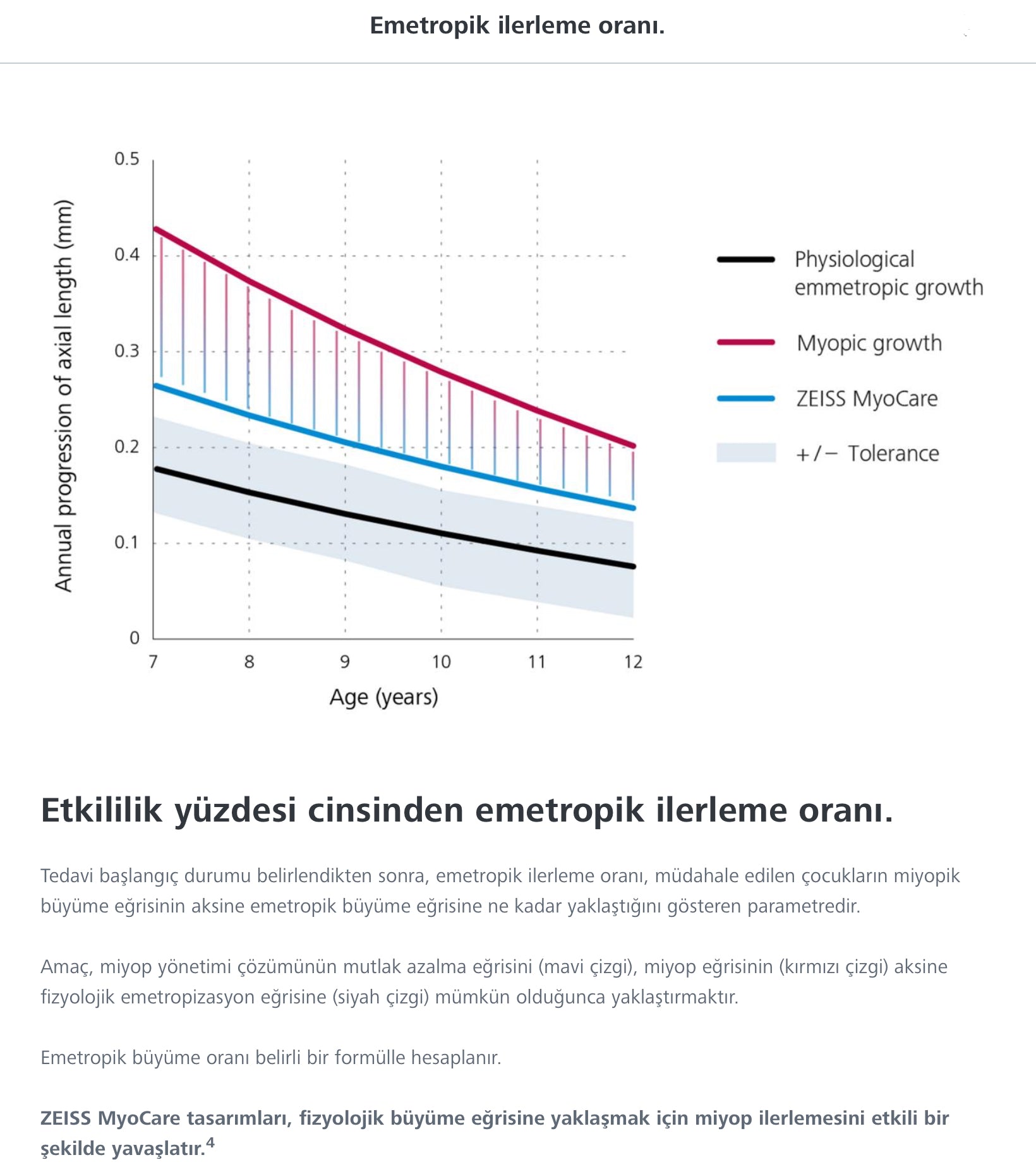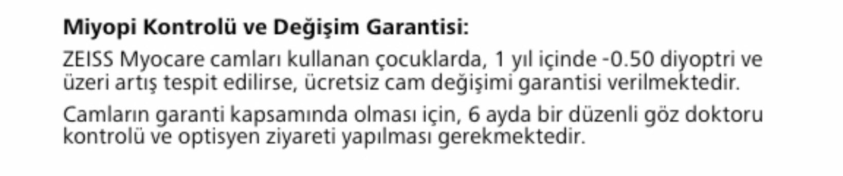 ZEISS MyoCare camları kullanan çocuklarda, 1 yıl içinde -0.50 diyoptri ve üzeri artış tespit edilirse, ücretsiz cam değişimi garantisi verilmektedir.