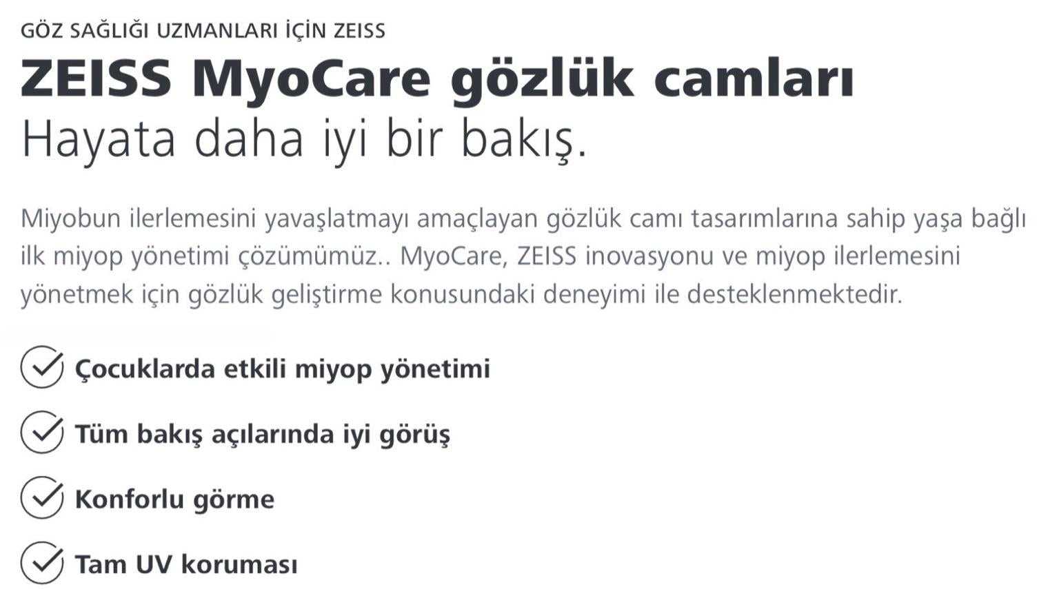 Göz sağlığını geleceğe taşıyan akıllı çözüm! Zeiss MyoCare, miyop çocuklarda görme kalitesini artırmakla kalmaz, aynı zamanda miyopi ilerlemesini bilimsel olarak yavaşlatmak amacıyla tasarlanmıştır. Zeiss’in ileri düzey optik mühendisliği ile geliştirilen bu özel camlar, çocukların günlük yaşamında kesintisiz konfor sunarken uzun vadeli koruma sağlar.