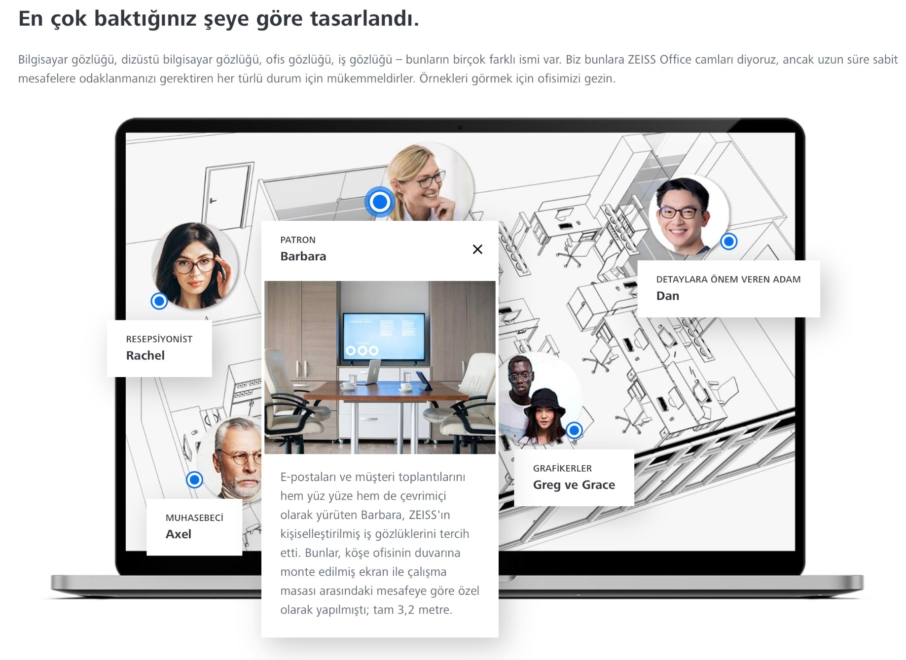 Kullanıcının iş yaşamındaki görsel gereksinimlerine göre, orta mesafeye özel olarak maksimum netlik sağlar. Üç farklı kullanım senaryosu sunar: