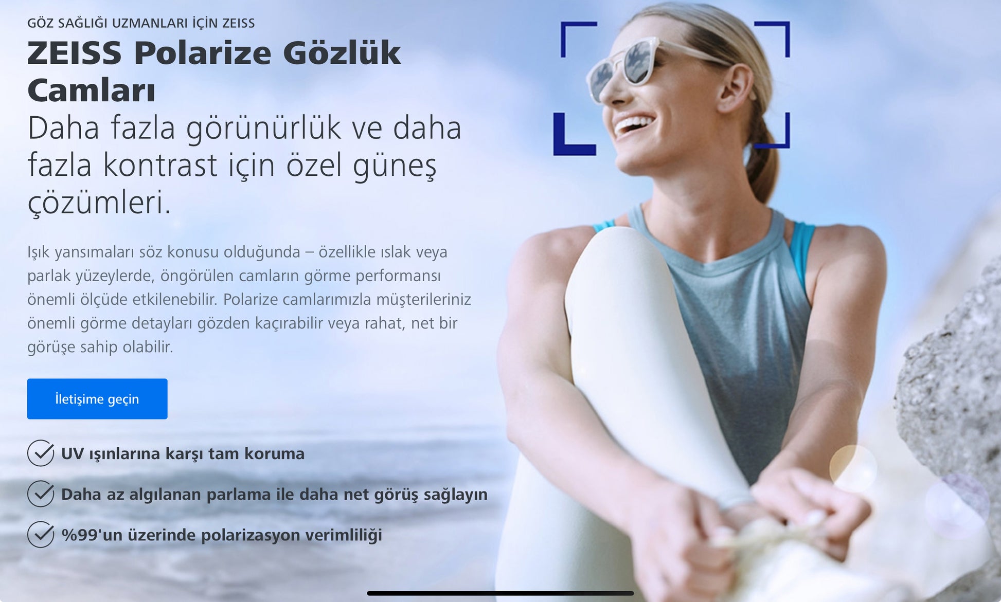 Sporcuların ve aktif yaşam tarzına sahip bireylerin ihtiyaçlarına özel olarak geliştirilen ZEISS Sport camlar, geniş ve saran çerçeve modellerinde dahi üst düzey netlik, estetik ve konfor sunar. Yüksek hızlı hareketlerde, açık hava etkinliklerinde ve ekstrem koşullarda bile keskin görüş sağlar.