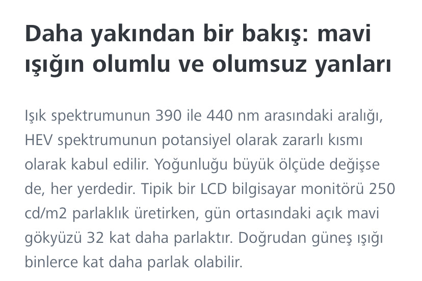 Gözleri zararlı mavi ışığın en yoğun olduğu 400–455 nm bandına karşı korur. Dijital ekran kullanımına bağlı dijital göz yorgunluğunu azaltmaya yardımcı olur. -